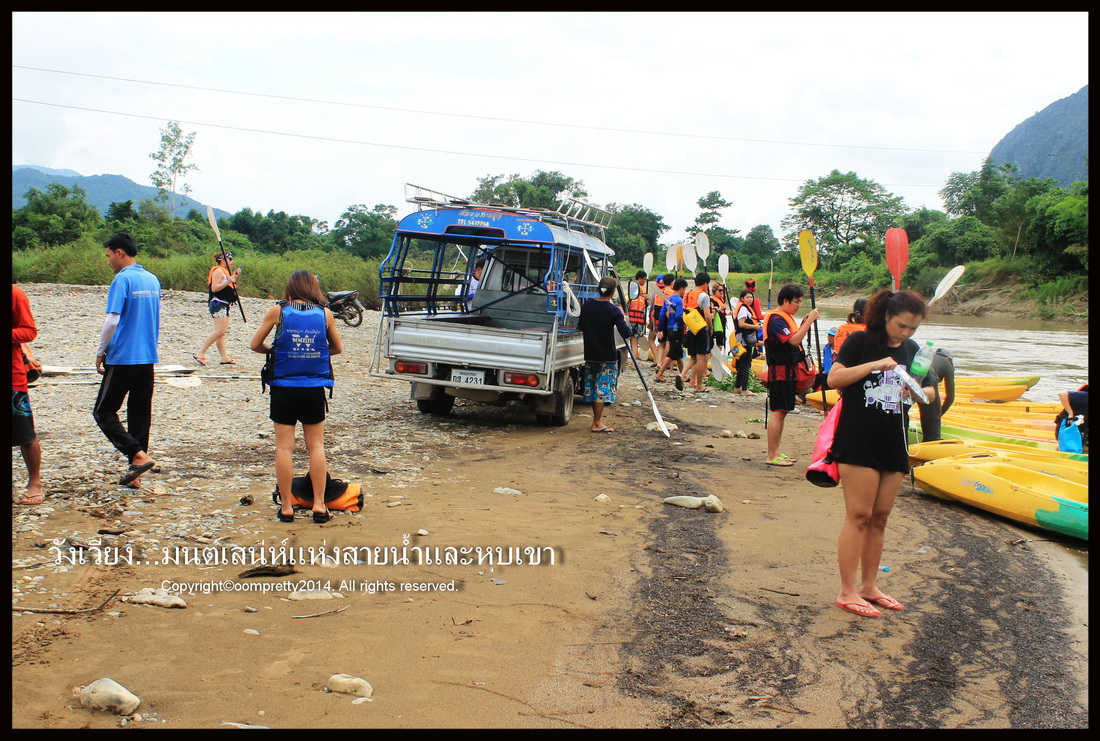 ถึงแล้วค่ะ นิดนึง จขกท. ซื้อกระเป๋ากันน้ำมาเอาไว้ถ่ายรูปตอนลงน้ำมาประมาณ 40 บาท ในวังเวียงมีขายเกือบทุกร้าน ดีค่ะต่อไปนี้ส่วนมากจะเป็นรูปจากมือถือเพราะเราเอกล้องใส่ในถุงกันน้ำไว้แล้ว ใจไม่ถึงพอเอาออกมา พลาดตกน้ำไป มีอันร้องไห้
