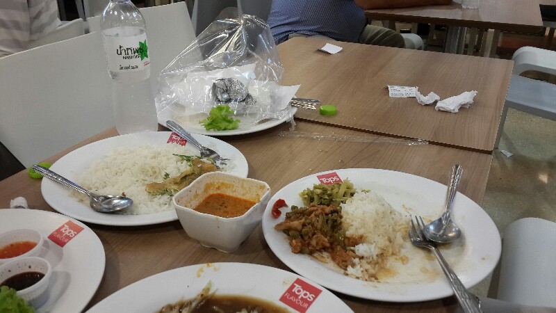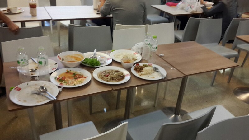 ผมจึงให้เพื่อนนั่งจองไว้ก่อน ผมกัยเพื่อนอีกสองจึงไปซื้อข้าวก่อน ระหว่านั้นเอง มนุษย์ลุงป้า สองผัวเมียที่นั่งจองอยู่ก่อนหน้านั้นด้านขวาสุดในภาพ คุณสามีร่างใหญ่วางกระเป๋าไว้ที่เก้าอี้เปล่าด้านข้างตัว จึงทำให้ที่ว่างที่ควรเหลือ 4 ที่นั้นกลายเป็นที่วางกระเป๋าไปเสียหนึ่งที่ ด้วยความที่กลุ่มเรามากันสี่คน ตามมารยาทเพื่อนคนแรกที่จองไว้จึงพูดกับชายซึ่งวางกระเป๋าบนเก้าอี้ว่า ขอเก้าอี้ตัวนี้ได้ไหมครับ เรามากันสี่คน (ซึ่งคนส่วนใหญ่ที่มาทานอาหารในศูนย์ที่คับแคบนี้มักจะวางไว้บนตักตัวเอง ถ้าไม่ใบใหญ่อะไรมากมาย) ซึ่งเพื่อนผู้หญิงคนนึงในกลุ่มเราก็วางกนะเป๋าไว้บนตักเธอนะครับ เพราะรู้ดีว่าที่น้อย ก็ไม่ควรจะเอาเปรียบคนอื่นๆที่ไม่มีที่ทาน