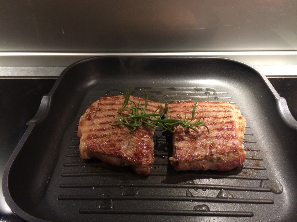 ขั้นตอนไม่มีอะไรมากค่ะ เตรียมเนื้อ Ribeye สวย ๆ เคล็ดลับที่เราเพิ่มมาคือการใช้ก้านโรสแมรี่สดมาถูไถกับเนื้อตอนทอด/ย่าง