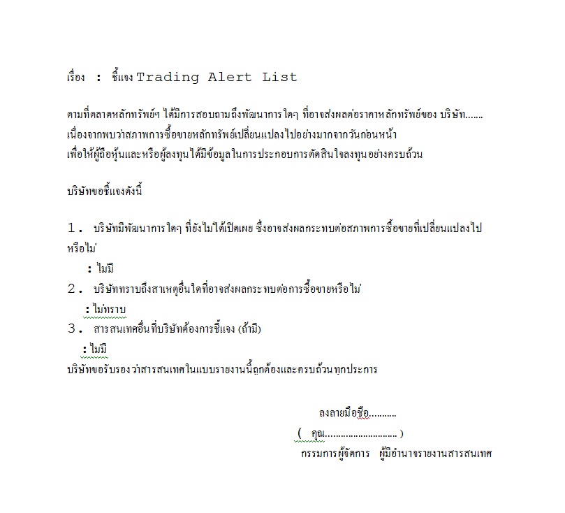 ชี้แจง Trading Alert List เรื่อง : ชี้แจง Trading Alert List ตามที่ตลาดหลักทรัพย์ฯ ได้มีการสอบถามถึงพัฒนาการใดๆ ที่อาจส่งผลต่อราคาหลักทรัพย์ของ บริษัท โซลูชั่น คอนเนอร์ (1998) จำกัด (มหาชน) (SLC)