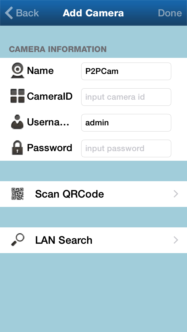 ให้กดปุ่ม LAN Search ก็จะเห็นกล้องตามรูปนี้เลยครับ ก็กดปุ่ม Done เพื่อเพิ่มกล้องเลยครับ ถ้าเจอกล้องในเมนูนี้ แน่ใจได้เลยครับ ว่ากล้องท่านออนไลน์ทางสายแลนแล้ว