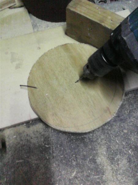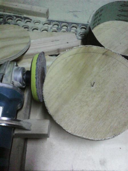 ตะปูตอกตรงกลางแผ่น เปิดเครื่องขัด มือก็หมุนจานไปเรื่อยๆ