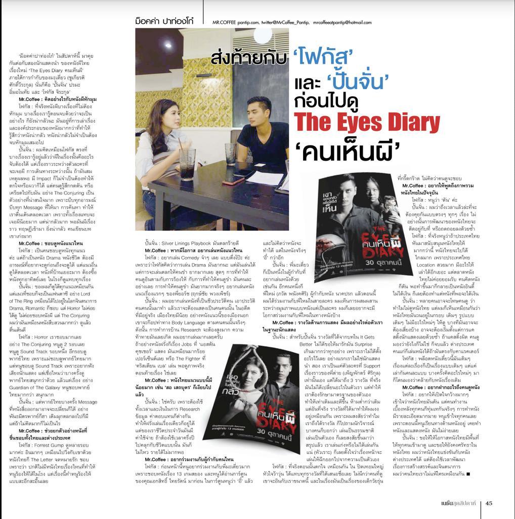 “ม็อคค่าปาท่องโก๋” สัปดาห์นี้ ได้มีโอกาสสัมภาษณ์สองนักแสดงนำ ของหนังผีไทยเรื่องใหม่ The Eyes Diary “คนเห็นผี” ภายใต้การกำกับของมะเดี่ยว ชูเกียรติ ศักดิ์วีระกุล นั่นก็คือ “ปั้นจั่น” ปรมะ อิ่มอโนทัย และ “โฟกัส จิระกุล”