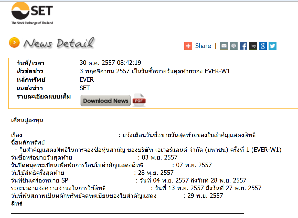 EVER-W1 : 3 พฤศจิกายน 2557 เป็นวันซื้อขายวันสุดท้าย