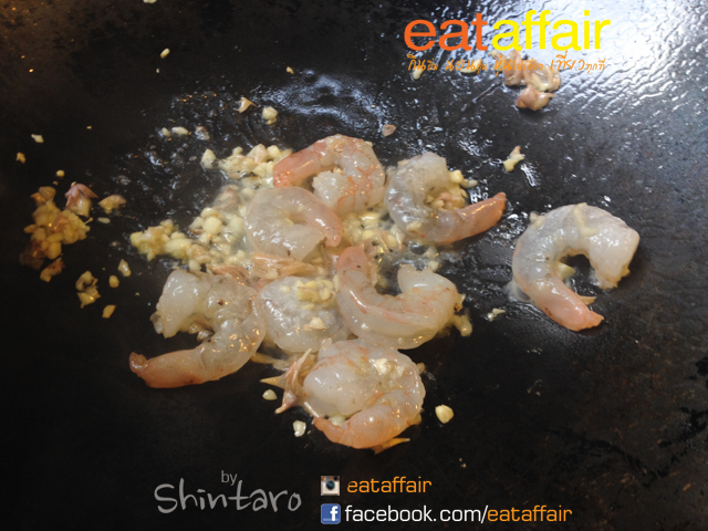 ตั้งกระทะให้ร้อน ใส่น้ำมัน นำกระเทียมลงไปผัดพร้อมกุ้ง