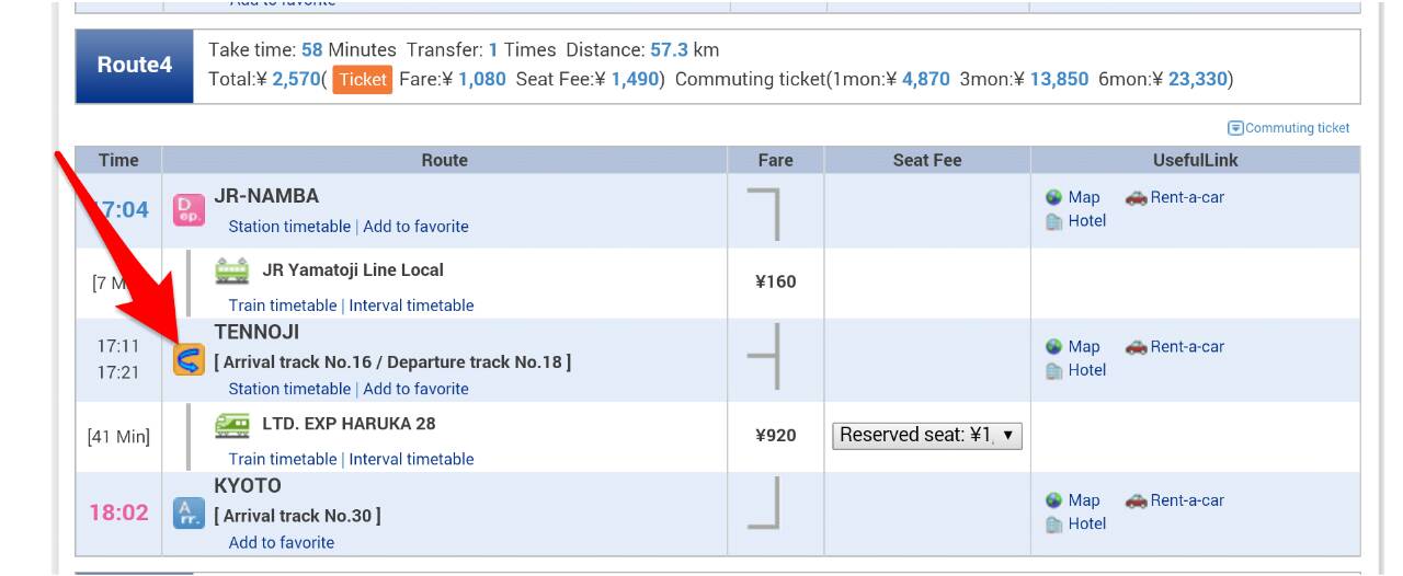 ขอถามเกี่ยวกับสัญลักษณ์ ลูกศร สีฟ้า บนพื้นสีส้ม เลี้ยวกลับ ใน hyperdia เส้นทางจาก inari to nara หมายความว่าอะไรเหรอคะ มันหมายความว่า ต้องนั่งรถ JR nara line local จาก inari ไปที่ Tofukuji แล้วรีบหา JR