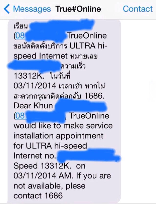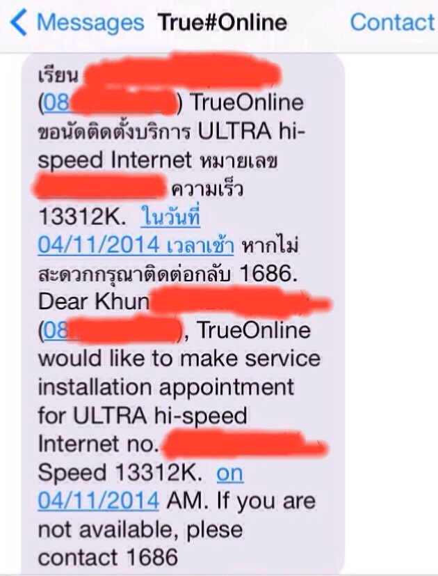 เรื่องมีอยู่ว่าเมื่อวันที่ 2/11/57 เราได้ไปขอเปิดใช้บริการอินเทอร์เน็ตบ้าน ที่ ทรู สาขาแฟชั่นไอแลนด์ ก็เลือกแพคเก็ต และเซ็นต์เอกสารเรียบร้อย (เราจดทะเบียนในนามชื่อเราแต่เบอร์บ้านที่มีอยู่แล้วคือชื่อของคุณพ่อ) เจ้าหน้าที่บอกว่าจะทำการเปิดใช้บริการได้ในวันรุ่งขึ้น (3/11/57) และจะมี sms แจ้งเข้ามาในเบอร์ติดต่อที่ให้ไว้ (ในที่นี้คือเบอร์ของเรา) พอกลับมาบ้านเราก็ทำการต่อไว้เรียบร้อย ที่นี่พอสักประมาณ 21.00 ได้มี sms แจ้งมาที่เครื่อง (รายละเอียดตามรูปค่ะ)