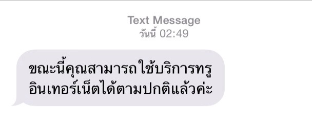 เราก็คิดว่าได้แล้วเลยลองเข้าดูก็ไม่ได้ จนเวลาประมาณ 11 โมงกว่าก็ไม่มีเจ้าหน้าที่ติดต่อมา เราก็เลยโทรไปที่ 1686 อีกครั้ง แล้วเราก็ต้องเล่าเรื่องใหม่หมดอีกครั้ง เฮ้อ!!! เจ้าหน้าที่คนนี้ก็บอกว่าไม่มีแจ้งไว้ในระบบว่าหมายเลขนี้ขอติดตั้งอินเทอร์เน็ต เราก็อ่านข้อความให้ฟังอีกที และก็บอกเจ้าหน้าที่ไปว่า เราจดทะเบียนชื่อเรา แต่ sms ที่ส่งมาในมือถือเรา กลับเป็นชื่อคุณพ่อ เจ้าหน้าที่ก็ลองคีย์ ชื่อเราเข้าไปก็ไม่มีรายละเอียดแจ้ง สรุปเราก็ถามว่า ตกลง เรื่องนี้ยังไง และเราได้ถามเจ้าหน้าที่ไปว่าในกรณีนี้น่าจะเกิดความผิดพลาดจากอะไร ทางเจ้าหน้าที่บอกว่าไม่ทราบ และเราก็ถามว่าแล้ว sms ถูกส่งมาได้ไง เจ้าหน้าที่บอกว่า อาจจะเป็นระบบส่งอัตโนมัติ (อย่างนี้ทางทรูก็สักแต่ว่าส่งผ่านระบบอัตโนมัติสิคะ ไม่ได้รู้เรื่องราวเหตุการณ์จริงเลยว่าเป็นยังไง มีปัญหามั้ย) (ต้องบอกก่อนว่าก่อนหน้านี้สัก 3-4 ปี เราเคยใช้บริการของทรูมาหลายอย่าง รวมถึงอินเทอร์เนต แล้วก็เจอปัญหา ด้านบริการแบบนี้ตลอด ในเรื่องก็ความผิดพลาดของเจ้าหน้าที่และการประสานงานกันในองค์กร ที่เราเองไม่เข้าใจว่าการติดต่อกับลูกค้าทุกครั้ง ไม่ได้มีการเรคคอร์ดไว้ในระบบหรือไง ทำให้เราต้องเล่าซ้ำๆ ซากๆ ยิ่งถ้าเราติดต่อหลายครั้ง หลายคน ก็ต้องเล่ายาวขึ้น และอีกข้อนึงคือ เจ้าหน้าที่มักจะตัดบทสนทนากับลูกค้าโดยการบอกว่าจะดำเนินการตามเรื่องให้แล้วจะโทรแจ้งกลับไป แต่ก็เป็นการโกหก เพราะตั้งแต่ติดต่อมา หลายต่อหลายครั้ง ไม่เคยมีเจ้าหน้าที่คนไหนโทรติดต่อกลับมาเลยสักคน เราคิดว่าผ่านมาหลายปีแล้ว คงจะมีการปรับปรุงแล้ว ถึงได้ใช้บริการอีกครั้ง อ่อ...สาขาที่เคยมีปัญหาก็เป็นสาขาแฟนชั่นฯ เหตุผลที่ใช้บริการสาขานี้เพราะเป็นสาขาสะดวก ใกล้บ้านค่ะ) สรุปเจ้าหน้าที่บอกว่าเดี๋ยวจะประสานงานกับศูนย์แฟชั่นฯ และจะติดต่อโทรแจ้งกลับ จน ณ บัดนี้ก็ไม่เห็นมีใครโทรมา แต่มี sms แจ้งมา (ตามรูปค่ะ)