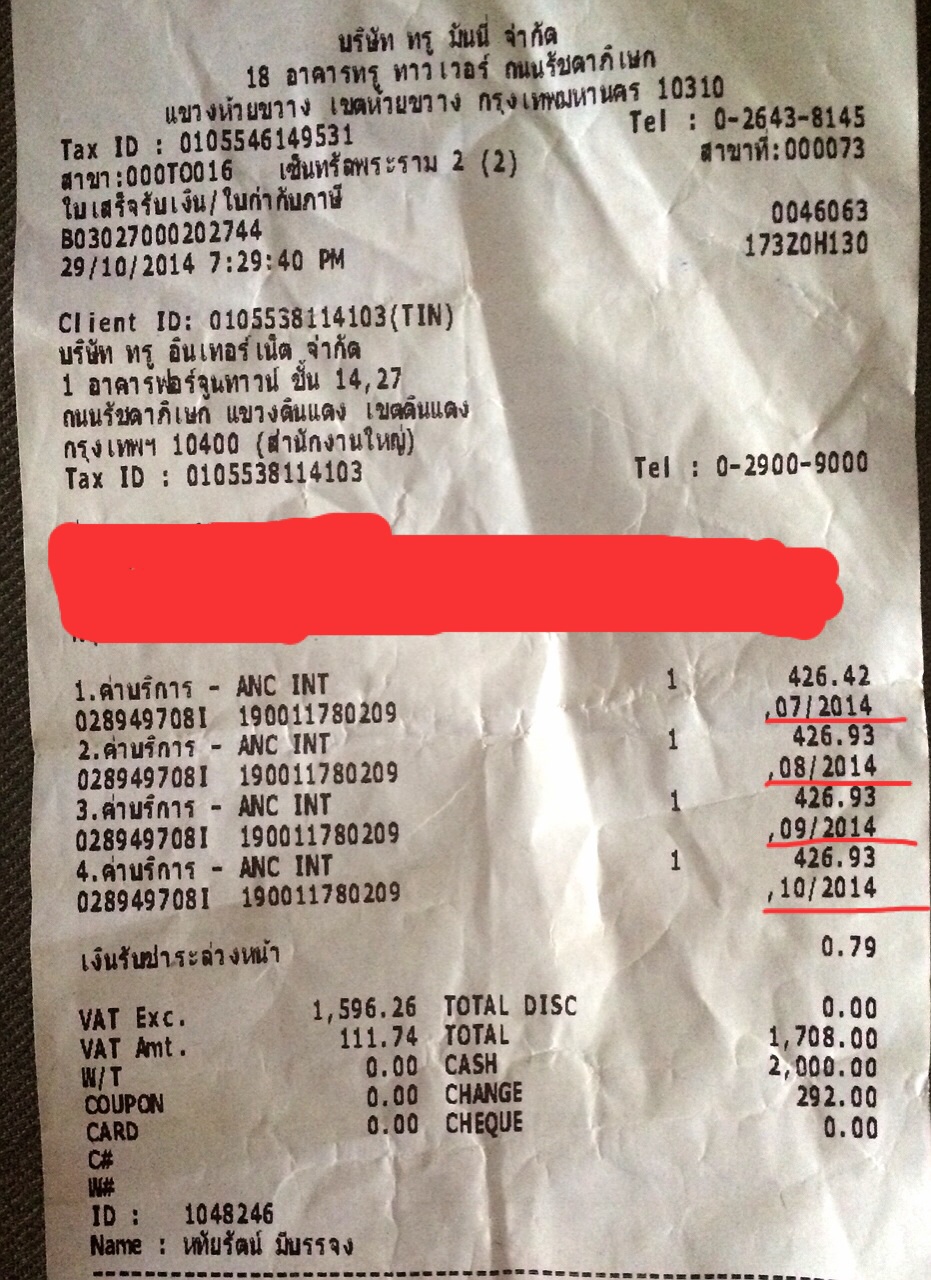 คือ วันที่29ต.ค. เราก็เล่นเน็ตได้ตามปกติ พอตอนเย็นเล่นเน็ตไม่ได้ ทางระบบบอกว่าค้างยอดชำระ เราเลยรีบโทไปหาแม่ให้รีบไปจ่ายเงินที เน็ตโดนตัด พอแม่จ่ายเส็ด เราก็เล่นเน็ตได้ปกติ [จ่ายเงินที่ True สาขา เซ็นทรัลพระราม 2]