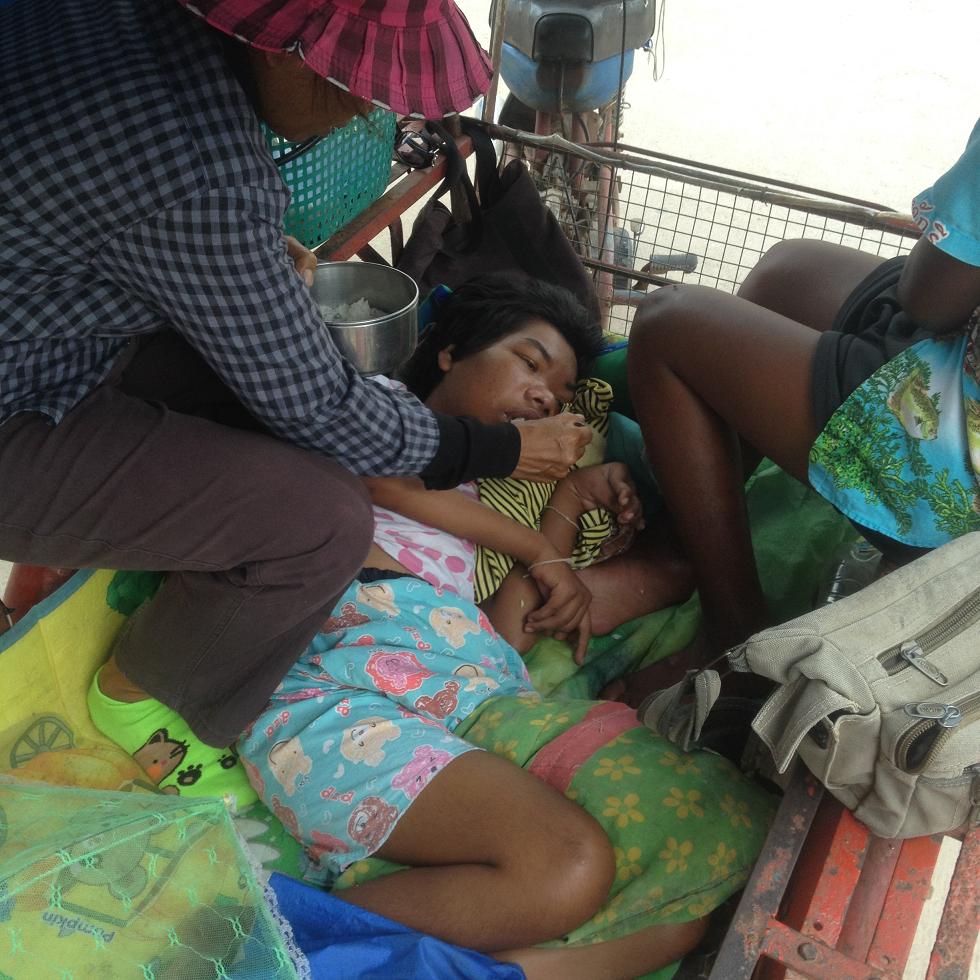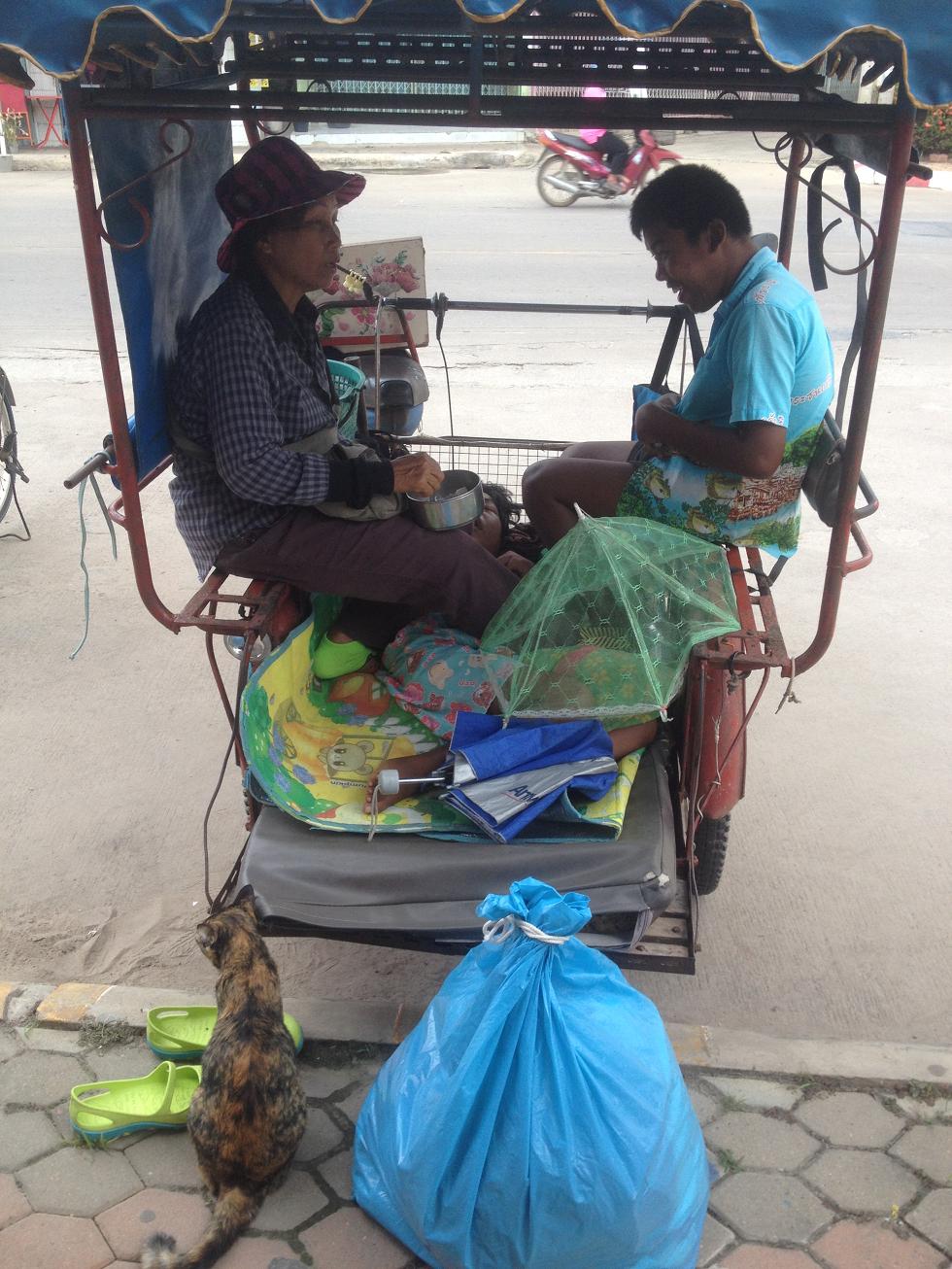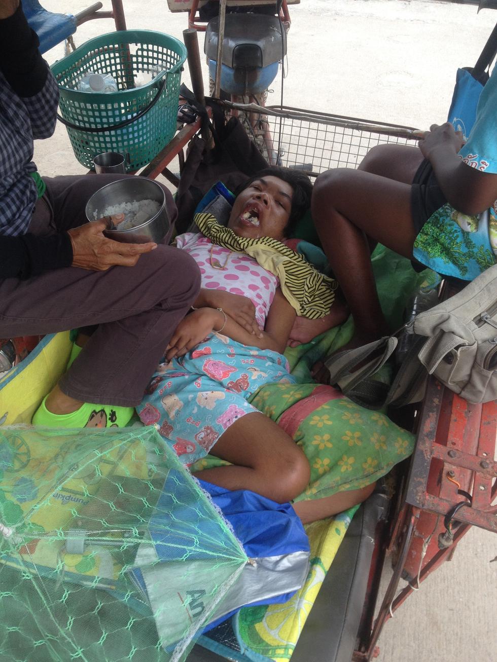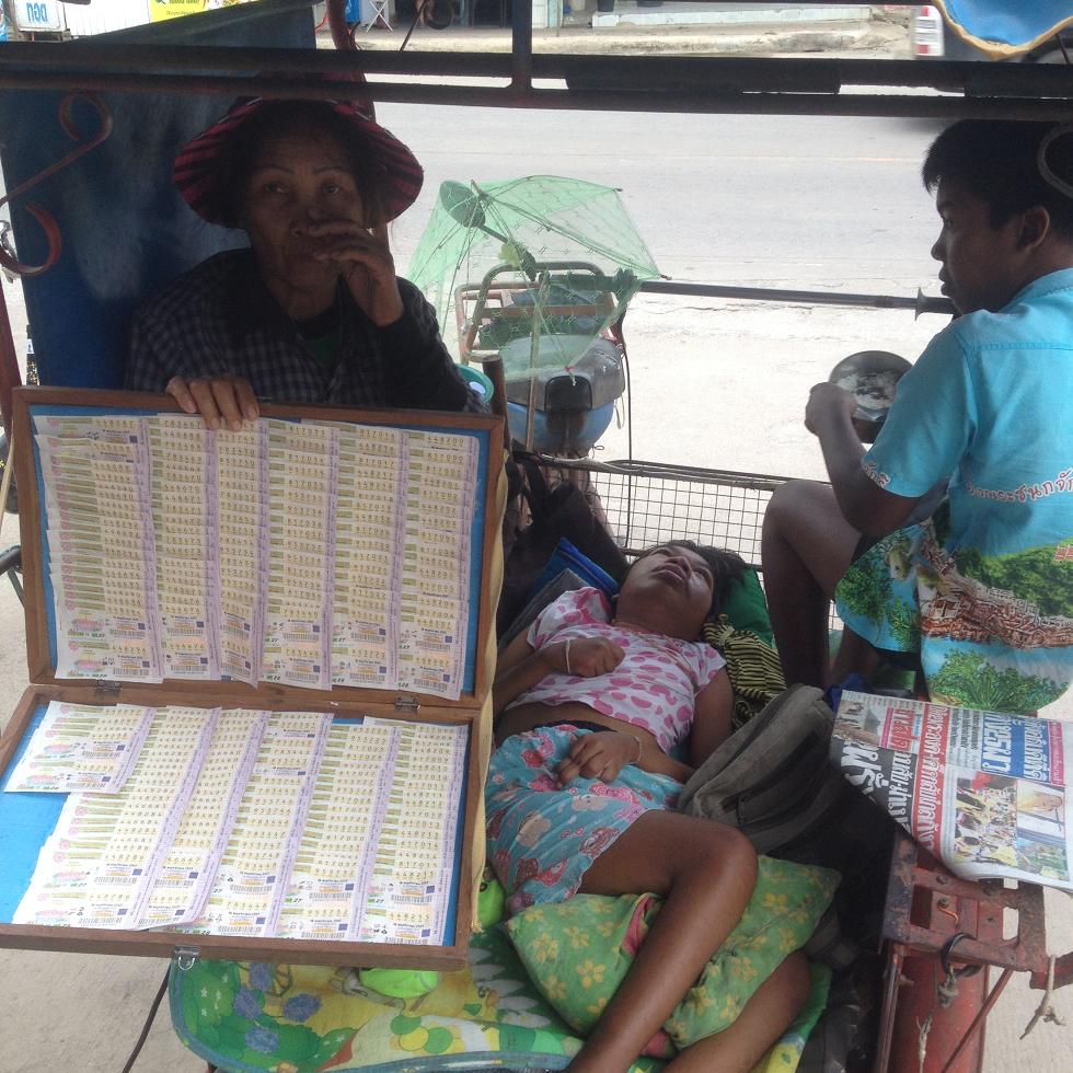 คุณป้าท่านนี้มีอาชีพหลักคือขายล็อตเตอรี่ แต่ที่น่าเห็นใจก็คือ ป้าแกมีลูกที่พิการถึงสองคน เวลาป้ามาขายล็อตเตอรี่ ป้าก็จะเอาลูกมาด้วยเพราะที่บ้านไม่มีใครดูแล คนน้องดีหน่อยที่ยังพอรู้เรื่อง กินข้าวได้เอง พูดรู้เรื่องบ้างไม่รู้เรื่องบ้าง แต่คนพี่ขยับตัวไม่ได้ พูดไม่ได้ เวลากินข้าวก็ต้องคอยป้อน ป้าแกบอกว่าลูกแกเป็นโรคสมองฟ่อ เป็นมาตั้งแต่เด็กแล้ว