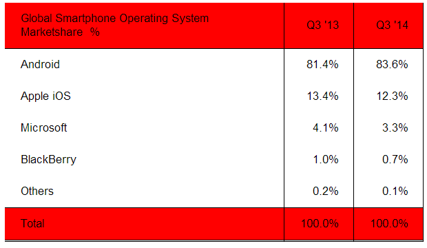 พูดถึง Android ที่ขายได้เพิ่มมากขึ้นกว่า 60 ล้านเครื่อง มีส่วนแบ่งเพิ่มขึ้นประมาณ 2% เท่านั้น จาก 81.4% มาอยู่ที่ 83.6% แม้จะมียอดขายที่เพิ่มขึ้นมากขนาดนี้ แต่ส่วนแบ่งก็ยังเพิ่มนิดหน่อย และสุดท้าย BlackBerry ลดจาก 1.0% มาอยู่ที่ 0.7%