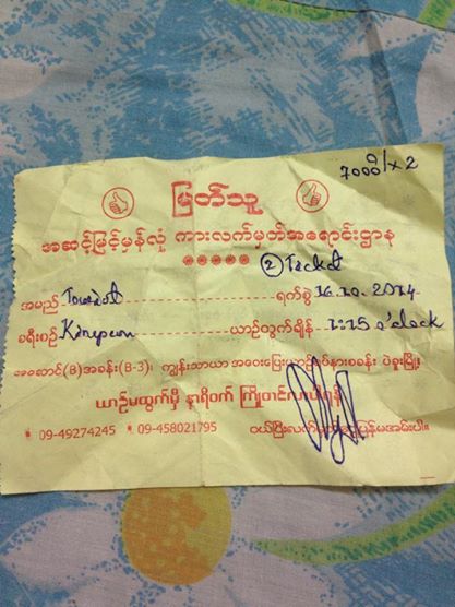 เราซื้อตั๋วรถโดยบอกเขาว่าเราจะไปลงคีติโย เขาคิดเราคนละ 7000 จั๊ด ซึ่งระหว่างรอรถของเขา เขาบอกว่ารถเขาไม่มา เขาให้ไปขึ้นรถโดยสารคันอื่น โดยโบกให้เรา แล้วให้เราขึ้นไปกับรถบัสแอร์ธรรมชาติ ไม่ได้เสียเงินเพิ่มนะ ลืมบอก เราบอกเขาไปลงคีติโย แต่เขาเขียนในตั๋วว่าไปจอดที่คิมปุนนะ