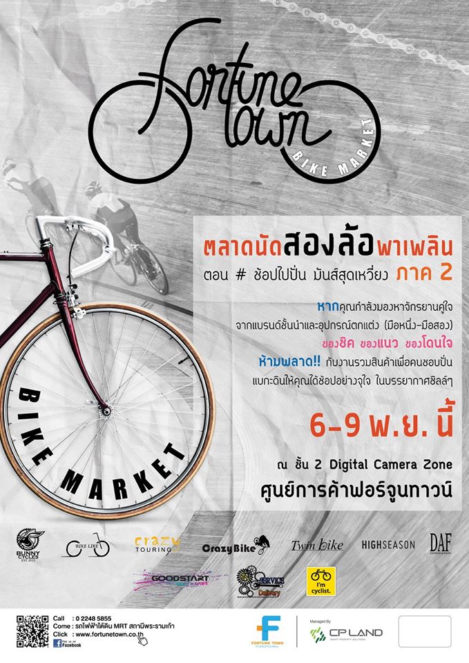 Fortune Town Bike Market”ตลาดนัดสองล้อพาเพลิน ตอน # ช้อปไปปั่น มันส์สุดเหวี่ยง ภาค 2 เปิดลานกิจกรรมชั้น 2 Digital Camera Zone แบกะดินให้ช้อปจักรยาน และอุปกรณ์ตกแต่งจากแบรนด์ชั้นนำ อาทิ อะไหล่จักรยาน ชุดนักปั่น กระติกน้ำ กระเป๋า รวมถึงสินค้าไอเดียต่างๆ ขนมาให้ช้อปในราคาพิเศษ ท่ามกลางบรรยากาศสบายๆ เดินทางง่ายๆโดยรถไฟฟ้า MRT ลงสถานีพระราม 9 วันที่ 6 - 9 พ.ย. นี้ ณ ลานกิจกรรมชั้น 2 Digital Camera Zone