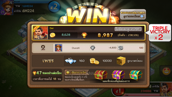 เดิมพันเพชร 20 เม็ด ชนะได้เพชร 30 + ลูกบาศก์ + ทอง ถ้าชนะเท่ากับว่าได้เพชรเพิ่ม 10 แพ้ได้ลูกบาศก์ + ทอง ถ้าแพ้เท่ากับว่าเสียเพชร 20 เพชร 2 ฝ่าย 20+20 กลายเป็น 30 :O เพชรหายเข้าระบบไป 10 กลยุทธ์ดูดเพช