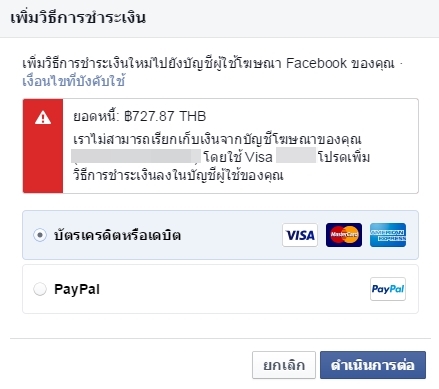 โฆษณาทางเฟสบุ๊ค ตัดผ่านบัตรเดบิตร ที่ผูกกับpaypal ไม่ได้ทำไงดีครับ