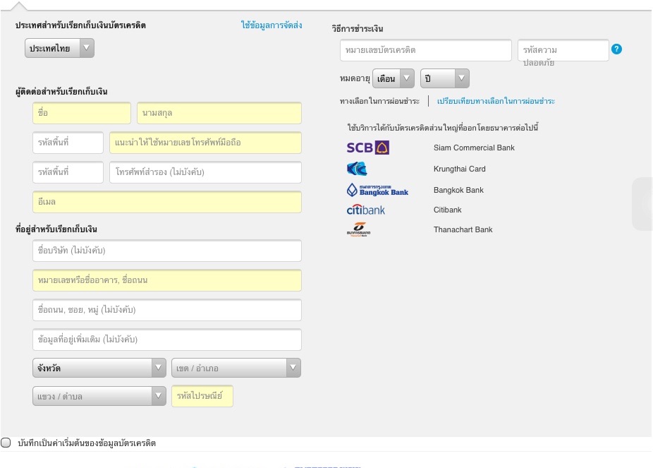พอดีกรอกที่อยู่เรียบร้อยแล้วอ่ะค่ะ แต่มางง ตอนชำระเงินค่ะ เราใช้บัตรเครดิตจ่าย พอดีเราใช้บัตรของแม่ซื้อค่ะ ตรงที่ ผู้ติดต่อสำหรับเรียกเก็บเงิน ต้องใส่ชื่อเราหรือชื่อของแม่คะ
