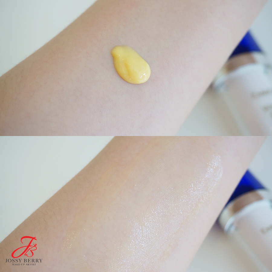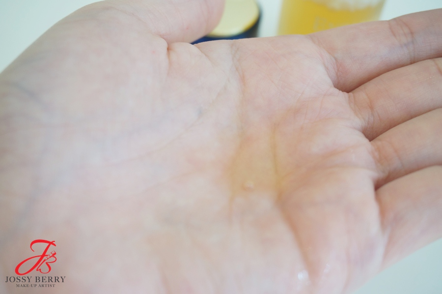 เนื้อเป็นสีเหลืองอ่อน ใสๆค่ะ แทบไม่มีกลิ่นเลย ลักษณะเป็นน้ำเหลวๆแต่เข้มข้น และซึมเข้าผิวไวมาก