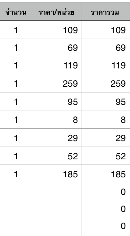 คือผมเขียนสูตรให้ [จำนวน * ราคา/หน่วย = ราคารวม]