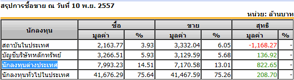 Sinthorn Summary 10/11/2557 : ต่างชาติซื้อสุทธิ 822.65 ลบ.