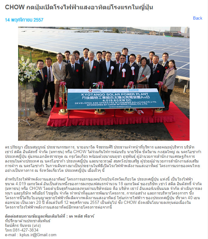 CHOW ความก้าวหน้าโรงไฟฟ้าพลังงานแสงอาทิตย์ที่ประเทศญี่ปุ่น เพิ่มเติม 1 โครงการ ขนาดกำลังการผลิต 3.2604 เมกะวัต