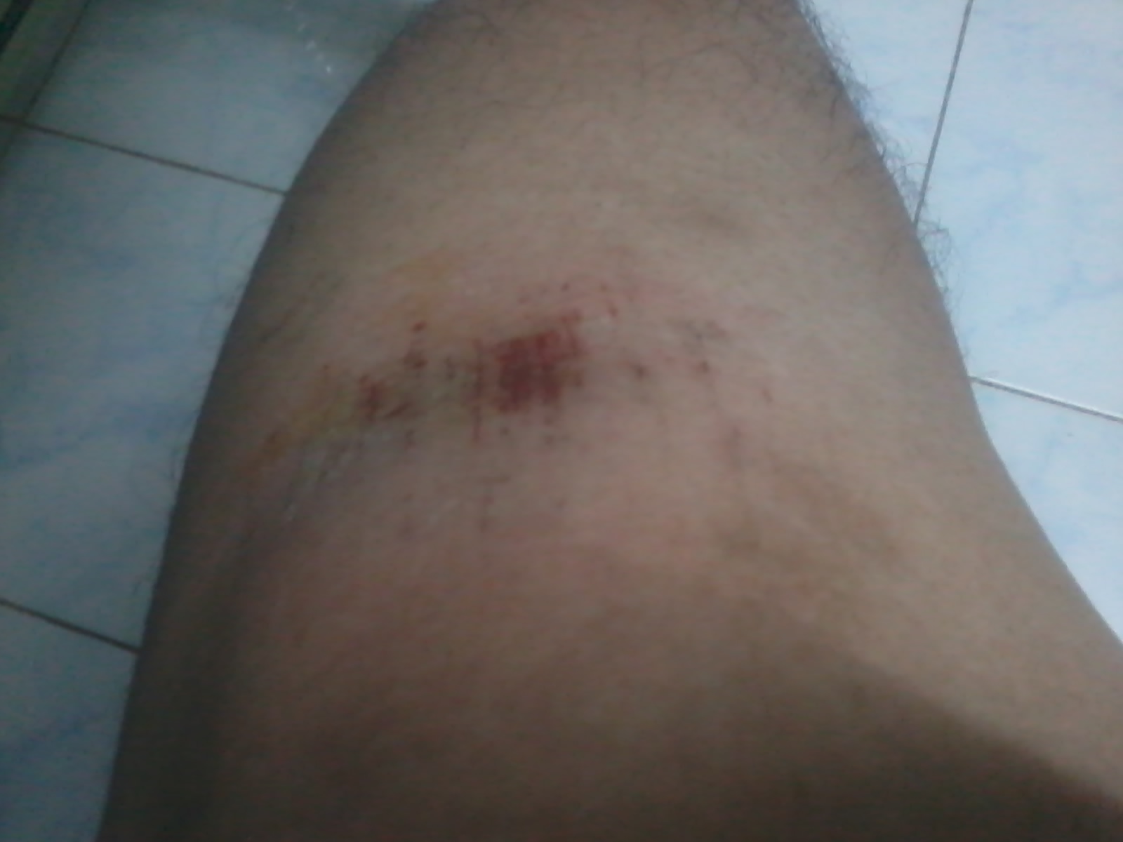 ตอนนี้ผมปฐมพยาบาลเบื้องต้นคือ เอายาแดงทาที่แผลแล้วครับ แล้วก็ใช้ผ้าเช็ดที่แผล