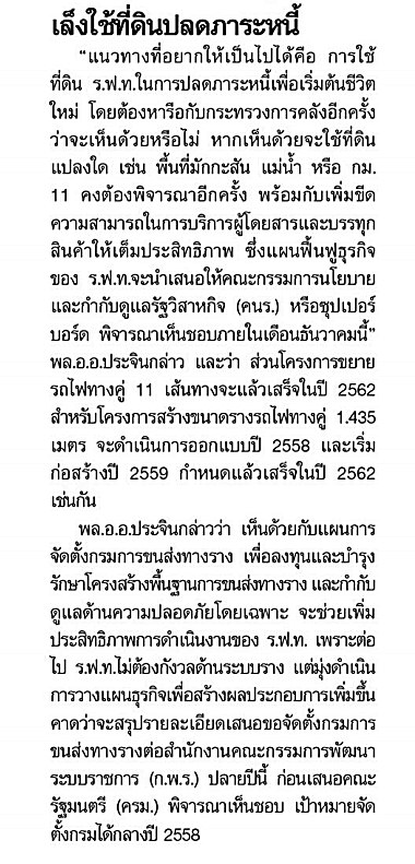 'คสช.' ปลดแอก หนี้รถไฟแสนล้าน โละที่ดิน 'มักกะสัน-แม่น้ำ' ล้างขาดทุน ประชาชาติธุรกิจ ฉบับวันที่ 24 กรกฎาคม พ.ศ. 2557