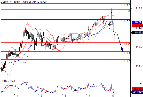 Our preference: Short positions below 116.5 with targets @ 115.35 & 114.9 in extension.