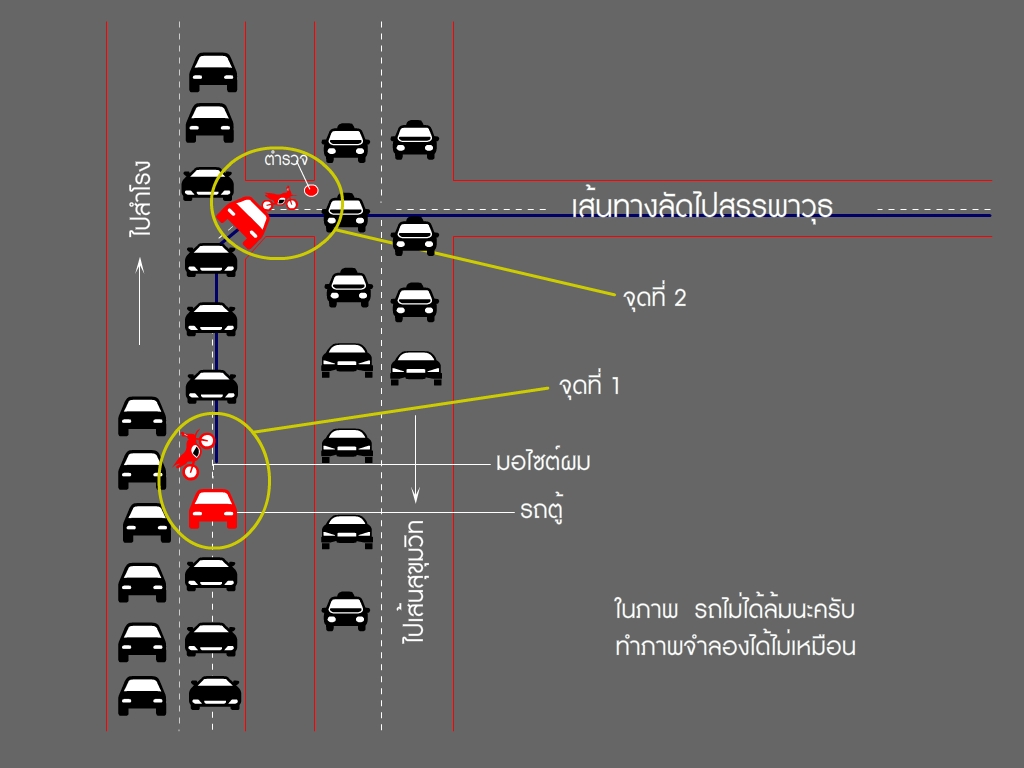 จุดที่ 2 พอถึงจุดเลี้ยวข้ามทาง ชลอเพื่อเลี้ยว ตำรวจจราจรอยู่ตรงนั้น กำลังโบกจราจรอยู่ รถที่ชนท้ายผม(รถตู้)อยู่ข้างหลัง ผมจึงหันไปมองหน้ารถเขา