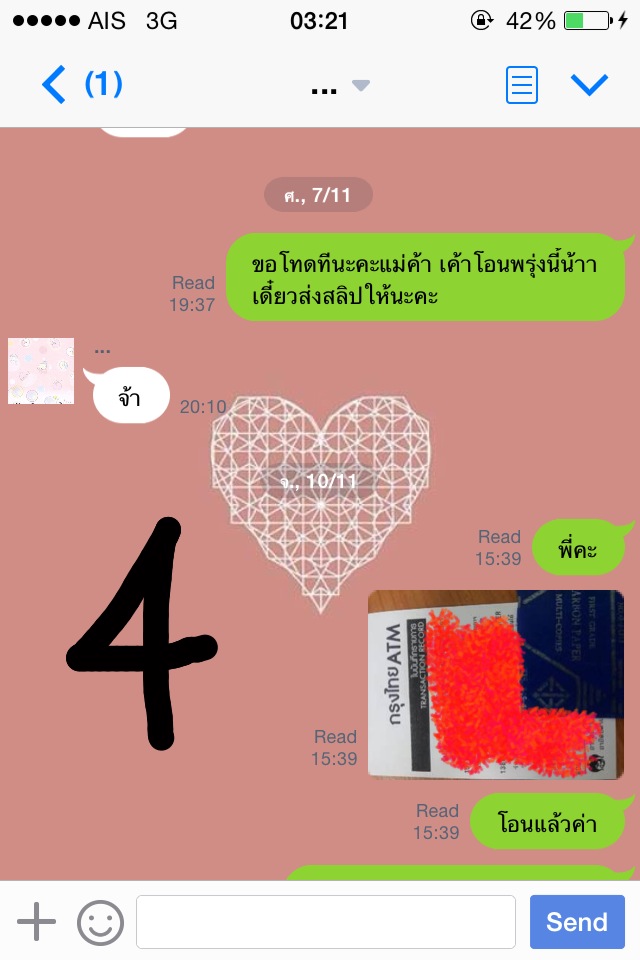 เราสั่งไปเย็นวันพฤหัสฯค่ะ แต่เรามาโอนเงินวันจันทร์ค่ะ พอเราโอนเสร็จเราก็ถ่ายสลิปไปให้แม่ค้าค่ะ เป็นอันว่าเรียบร้อย