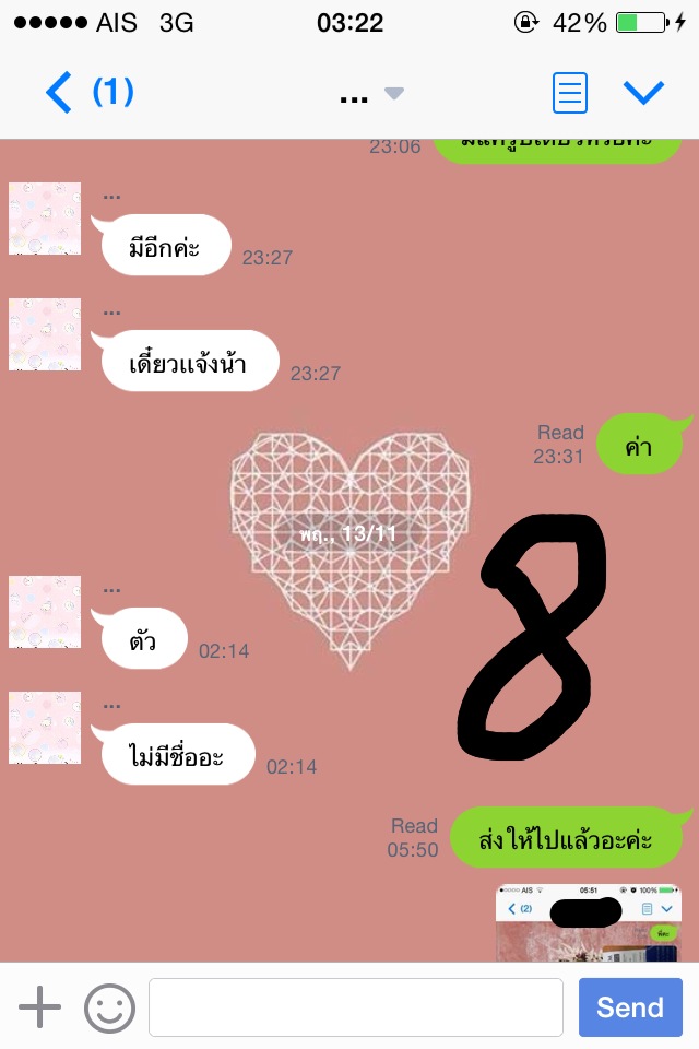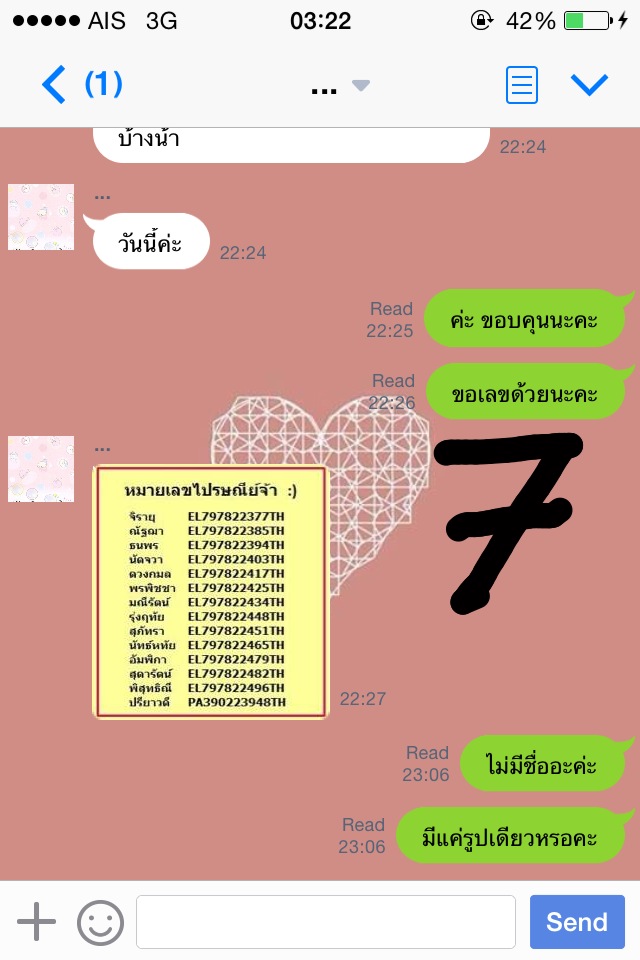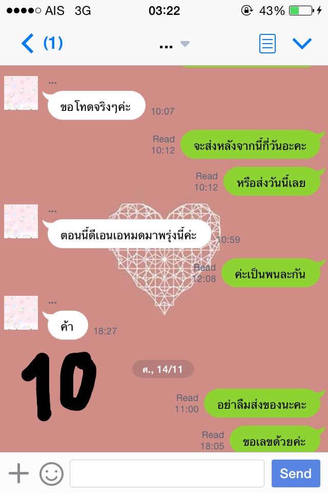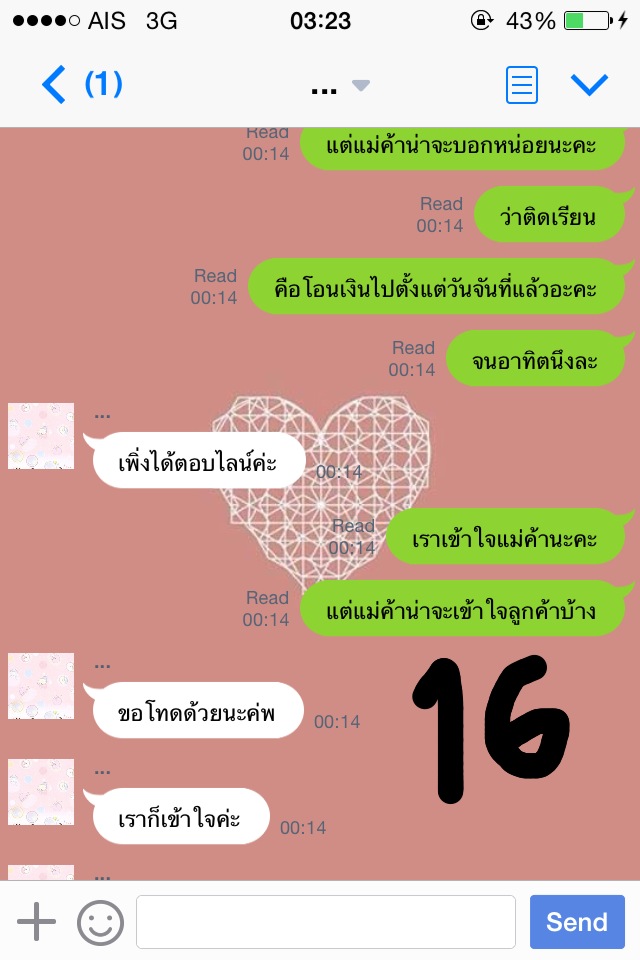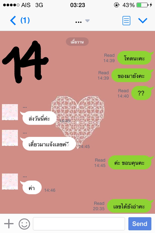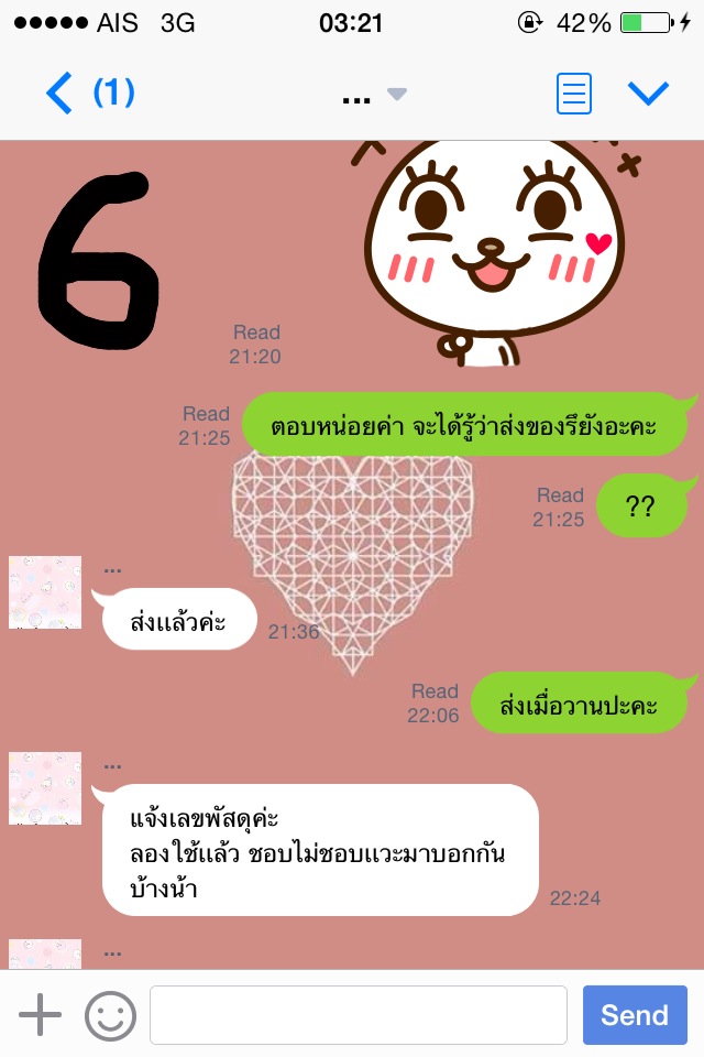 จนล่าสุดคือวันจันทร์ที่ 17 พ.ย. 57 ค่ะ เราทักไปเวลา 14.40 ถามว่าของมารึยัง เพราะว่าวันนี้วันจันทร์ ไปรษณีย์ทำงานแล้วค่ะ แม่ค้าบอกส่งวันนี้ เดี๋ยวมาแจ้งเลข เราก็โล่งอกเลยค่า แต่ที่ไหนได้ ไม่มีการทักมาแจ้งเลขพัสดุใดๆทั้งสิ้นเลยค่ะ