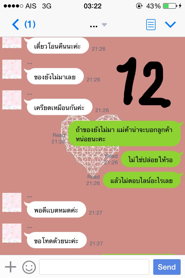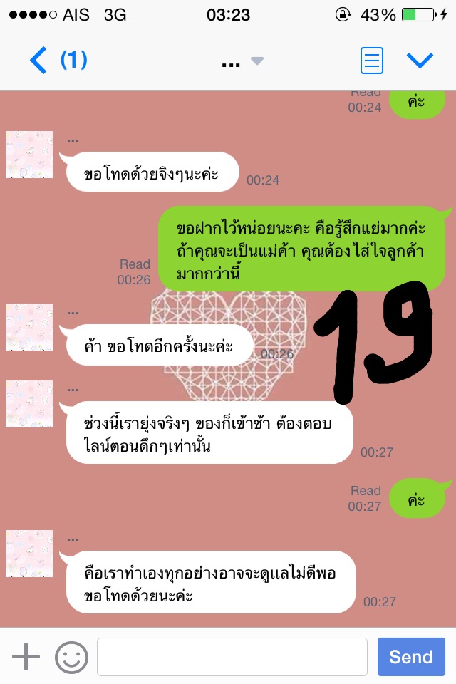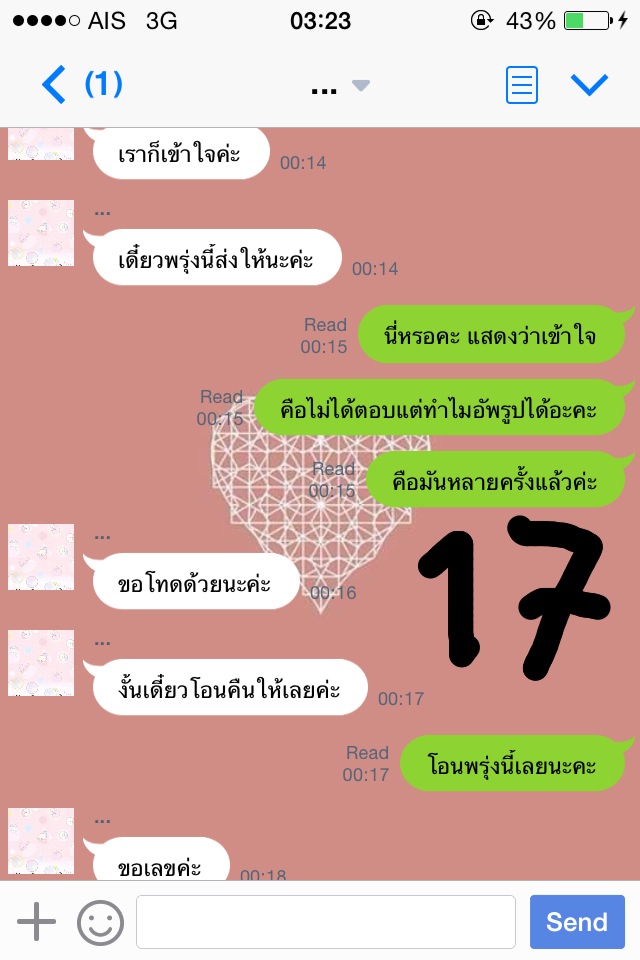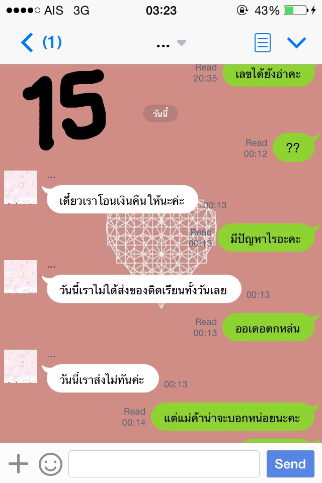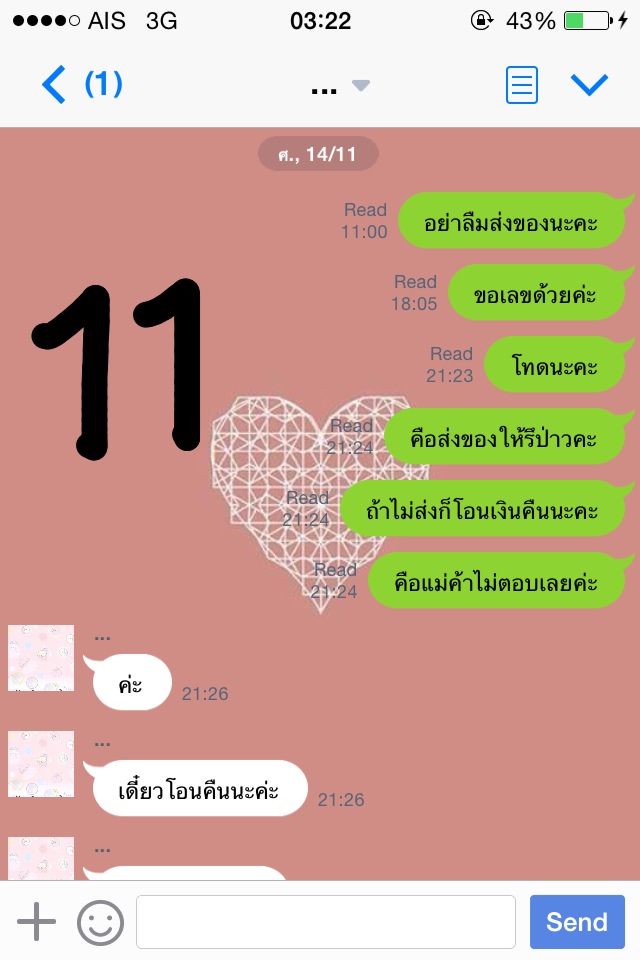 ครั้งที่สองคือวันศุกร์ที่ 14 พ.ย. 57 ค่ะ เราทักไปเวลา 11.00 แม่ค้าก็ไม่ตอบค่ะ เราทักไปอีกทีเวลา 18.00 ว่าขอเลขพัสดุค่ะ แม่ค้าก็ยังไม่ตอบ เราคิดในใจล่ะค่ะว่า โดนหลอกแน่ๆ แต่ก็อดทนค่ะ ทักไปอีกทีเวลา 21.20 เรายอมรับเลยว่าเราเหวี่ยงค่ะ เราโมโหเพราะว่าแม่ค้าไม่ตอบไลน์แต่สามารถอัพรูปในไอจีได้ค่ะ เรานี่งงเลยค่ะ ทักไปเยอะๆเลยค่ะ แม่ค้าตอบค่ะ ตอบว่าอะไรรู้มั้ยคะ " ค่ะ เดี๋ยวโอนเงินคืนนะคะ ของยังไม่มาเลยค่ะ เครียดเหมือนกัน " เราก็แบบเฟลเลย เพราะว่าเราก็รอของใช่มั้ย แต่คือแม่ค้าไม่มีการทักมาบอกอะไรเราเลยค่ะ เงียบไปทั้งวันเลยอะ แม่ค้าบอกว่าแบตหมด เราก็ต้องเชื่อสิคะ5555555555 โมโหมากๆอะ แล้วแม่ค้ามาบอกว่าโรงงานเลื่อนค่ะ เป็นวันรุ่งขึ้น โอเคเราบอกว่าได้ของแล้วรีบส่งเลยนะคะ