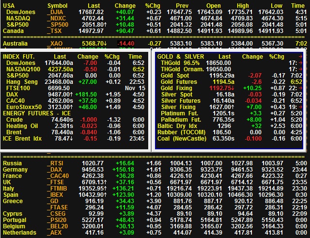 ดาวโจนส์ เพิ่มขึ้น 40.07 จุด (0.23 เปอร์เซ็นต์) ปิดที่ 17,687.82 จุด เอสแอนด์พี เพิ่มขึ้น 10.48 จุด (0.51 เปอร์เซ็นต์) ปิดที่ 2,051.80 จุด แนสแดค เพิ่มขึ้น 31.44 จุด (0.67 เปอร์เซ็นต์) ปิดที่ 4,702.44 จุด