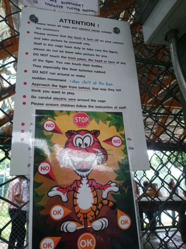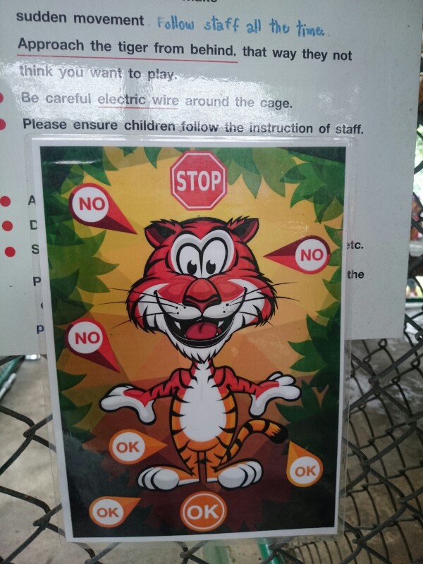 ก่อนที่จะเข้าไปในเขตกรงเสือ จะมีเจ้าหน้าที่แจ้งข้อควรระวังส่วนไหนที่เราไม่ควรยุ่งกับอวัยวะเสือ