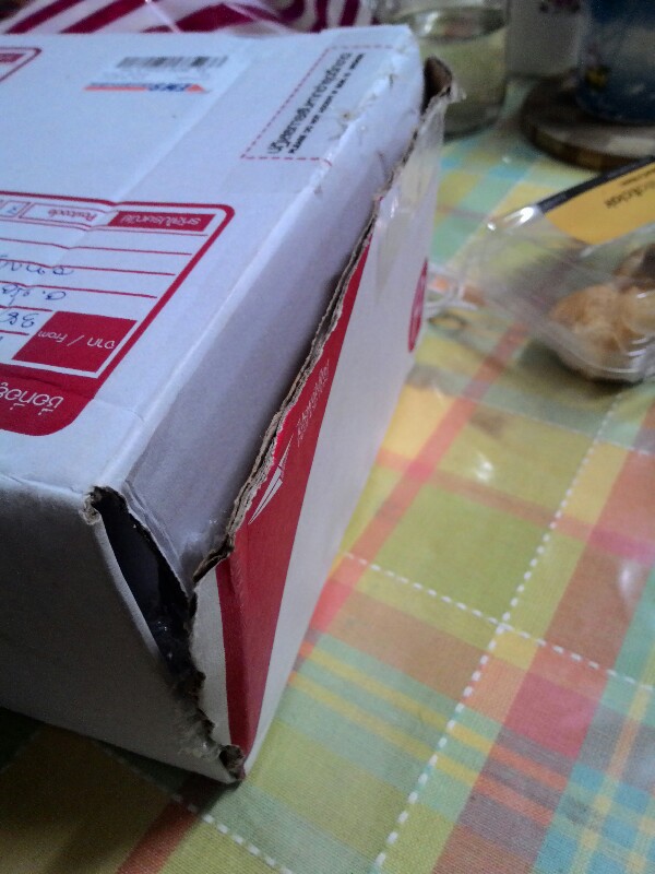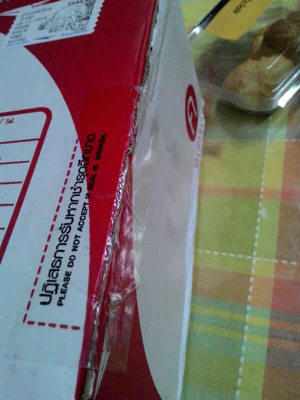 เฮ้อออนี่คือผลงานของไปรษณีย์ไทย(อีกแล้ว) เพิ่งเคยเจอกะตัวก็วันนี้เอง ถ้าถูกของอื่นๆทับมาแล้วเละขนาดนี้จะไม่ว่าเล้ยยยยย นี่มันรอยแกะชัดๆ แถมไม่ปิดกล่องให้เรียบร้อยเหมือนเดิมอีก เอาส่วนที่ขาดยัดลงในกล่อ
