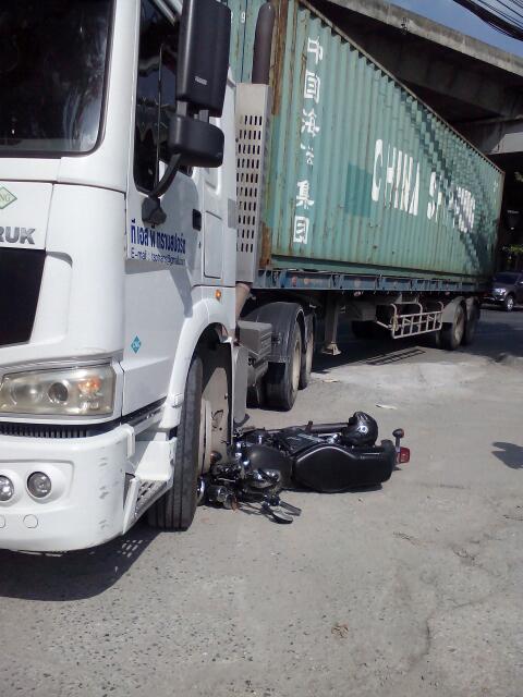 รถพ่วงทับมอเตอร์ไซค์ คนขับมอเตอร์ไซค์สงสัยนำส่งโรงพยาบาลแล้วครับ เห็นถุงมือ ของคนขับวางอยู่ครับ