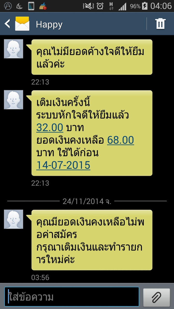 เพิ่งเติมเงินไป100 ตอนสี่ทุ่มเมื่อวาน มีข้อความว่าหักใจดีแล้วเหลือ 68