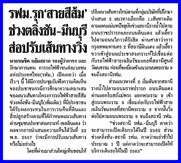 รฟม.รุก 'สายสีส้ม' ช่วงตลิ่งชัน-มีนบุรี ส่อปรับเส้นทางวิ่ง ---- สคร.แก้กม. ดึงเอกชน พัฒนาระบบราง