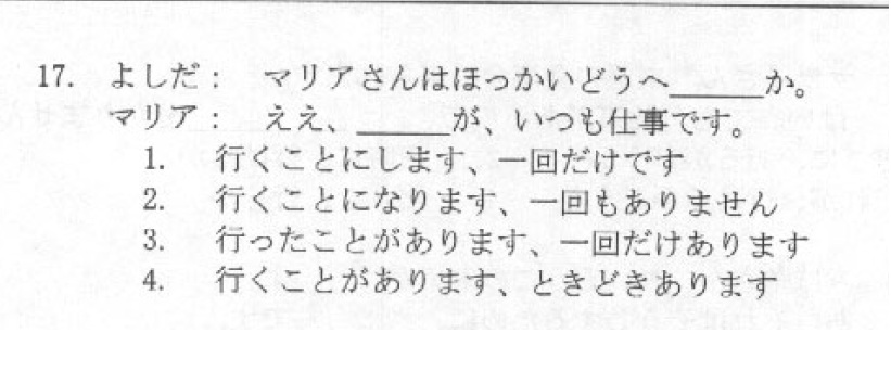 เฉลยข้อนี้คือ 4 แต่หนูคิดว่าน่าจะเป็น 3 เพราะตามประโยคแล้ว よしだ น่าจะถามว่าเคยไปฮอกไกโดมั้ย? ใช่มั้ยคะ?