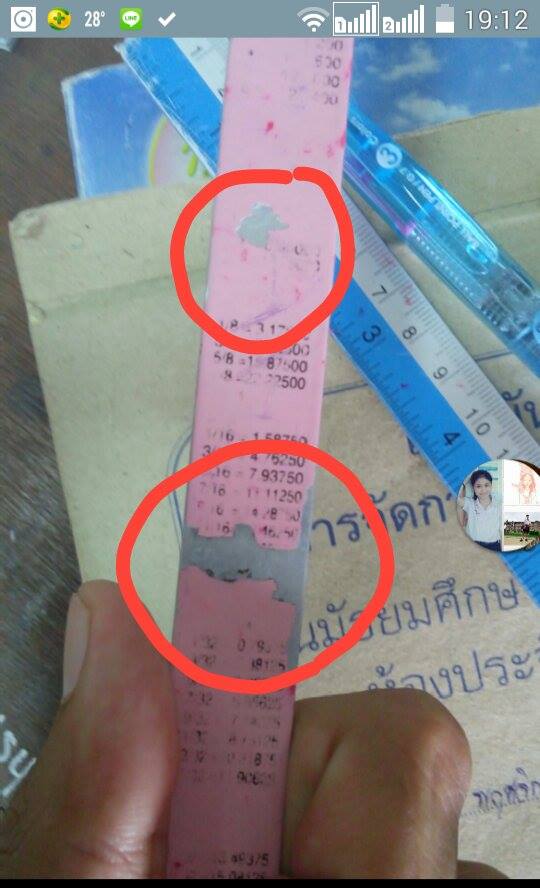 ต้องบอกก่อนว่าอ่านแล้วอาจรู้สึกว่าปัญญาอ่อนนิดหน่อยแต่ตอนเจอเหตุการณ์จริงๆมันไม่ได้ปัญญาอ่อนเลย......คือผมมีไม้บรรทัดอยู่อันหนึ่งครับเรียกว่าเป็นไม้บรรทัดคู่บุญเลยก็ว่าได้เพราะผมใช้มาตั้งแต่ ม.3 จนสอบเข้า ม.4 ได้โรงเรียนใหม่ก็ยังคงใช้ไม้บรรทัดอันนี้อยู่(ต้องขอบอกว่าพาไม้บรรทัดอันนี้ไปสอบที่ไหไหนคะแนนก็จะดีทุกครั้ง) ผมก็ใช้มันมาเรื่อยๆจนกระทังมาถึง ม.4 เทอมสองจำได้แม่นเลยว่าพึ่งเปิดเทอมได้สักสองอาทิตย์อยู่ๆไม้บรรทัดอันนี้ก็หายไปโดยไม่รู้ตัว!!! คือพอร็ว่าหายไปก็ตอนอยู่บ้านแล้วตอนนั้นอารมณ์ประมาณว่าเซ็งมากๆเลยอะครับ........แต่พอเวลาผ่านไปผมก็ได้ลืมเรื่องไม้บรรทัดนี้ไปตามระเบียบ จนกระทั่งวันนี้!!!!ก็ถึงคาบเรียนฟิสิกส์(ห้องเรียนวิทจะเป็นนั้งเป็นกลุ่ม)ผมก็นั้งเรียนตามปกติทันใดนั้นเอง!!!สายตาของผมก็หันไปเจอไม้บรรทัดของผม ผมจำได้แม่นเลยว่าต้องเป็นของผมแน่ๆเพราะมีตำนิที่ผมทำไว้อย่างชัดเจนทุกจุด และที่สำคัญมันกำลังอยู่ในมือของเพื่อนผมมมมมมม!!! ทำไงละทีนี้ตั้งสติสิครับ ตั้งสติได้ก็ถามเพื่อนกลับไปอย่างใจเย็นว่าไม้บรรทัดนี้เอามาจากไหน มันก็บอกว่าซื้อมาใช้มาตั้งนานแล้วด้วย !! ผมนี่ตาแตกสิครับ ก็มันเห็นอยู่ว่าร่องรอยนี้เราทำมาเองอะไรมันจะบังเอิญเหมือนขนาดนี้ ก็บอกไปว่ารอยนี้ มันเป็นรอยที่เราทำขึ้นมาพอถามไปถามมาถามย้ำๆจนในที่สุดมันก็ยอมรับ แต่!!!