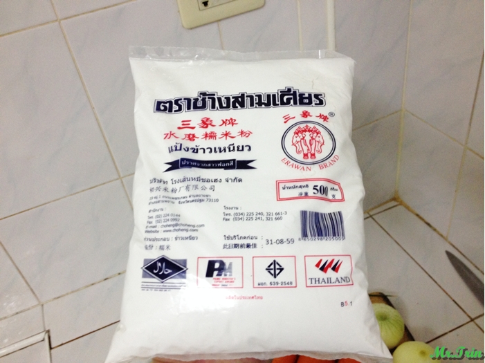 แป้งข้าวเหนียว 5 ทัพพี และน้ำ 5 ถ้วย คนให้เข้ากันก่อน ตัวแป้งต้องไม่ข้นมากนะครับ