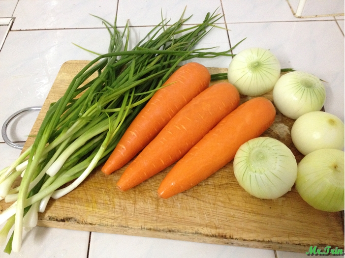 ต้นหอม 1 กำมือ แครอท 3 หัว และหอมหัวใหญ่ 5 หัว
