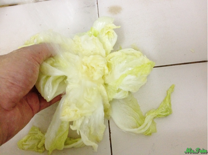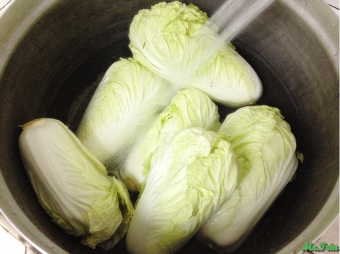 แช่ผักกาดขาวทิ้งไว้ 30 นาทีแล้วคลี่ใบของผักกาดแต่ละหัวล้างผ่านน้ำ