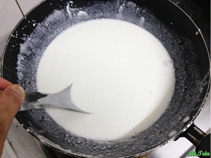 เปิดไฟเบาๆ คนไปเรื่อยๆ พอตัวแป้งเริ่มหนืดและเปลี่ยนเป็นสีดังภาพปิดเตาแล้วยกลงทิ้งไว้ให้เย็นนะครับ
