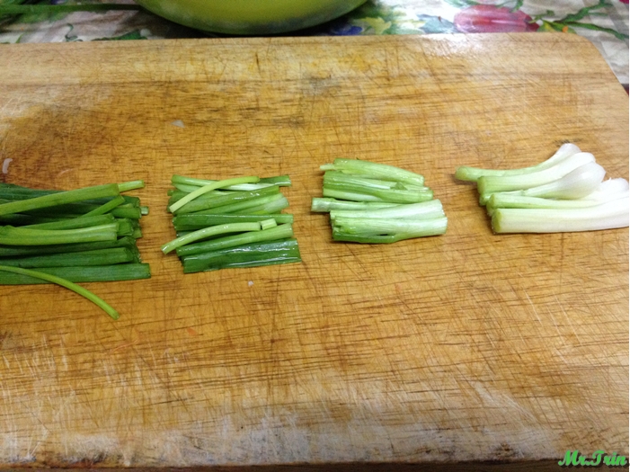 ตัดต้นหอมประมาณ 1-2 นิ้วแล้วผ่าหัวมันออกจากกัน เพื่อความสะดวกเวลาเคี้ยวครับ จากนั้นนำผักดังกล่าวเข้าตู้เย็น
