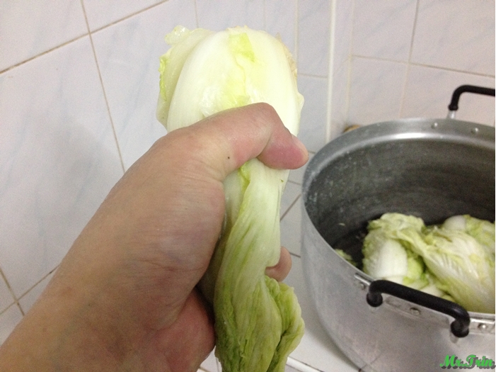นำผักกาดขาวมาคว่ำหัวเพื่อให้สะเด็ดน้ำ รอประมาณ 5-10 นาที