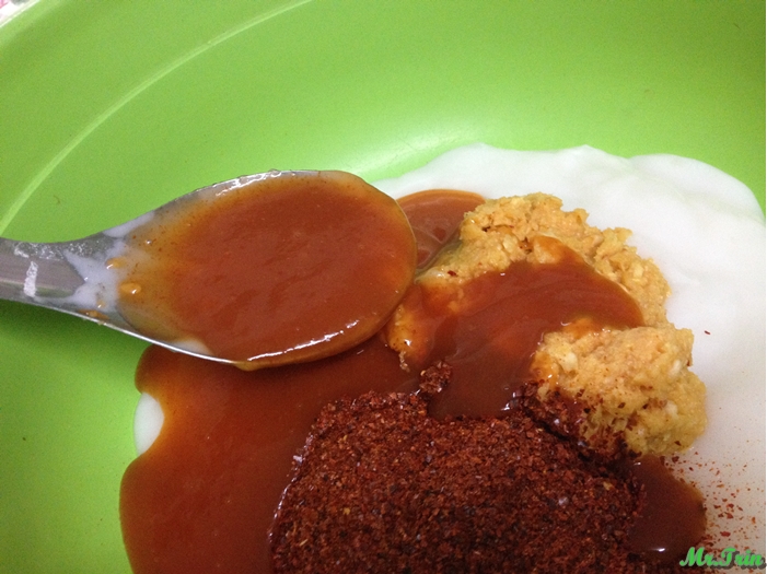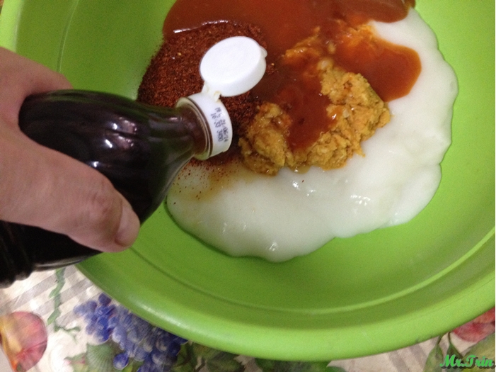 นำแป้งที่เคี่ยวและเย็นแล้ว พริกแห้งปั่น และกระเทียม ขิงโขลกละเอียด มาผสมกัน