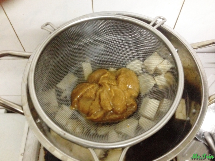 วางกระชอนใส่เต้าเจี้ยวบดลงไป 1 ทัพพีครึ่ง แล้วคนให้ละลาย กากเต้าเจี้ยวทิ้งให้หมด ชิมรสหากไม่เค็มพอเติมเต้าเจี้ยวบดครั้งละ 1 ช้อนโต๊ะ ชิมจนได้รสชาติที่พอใจ