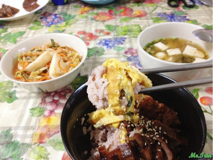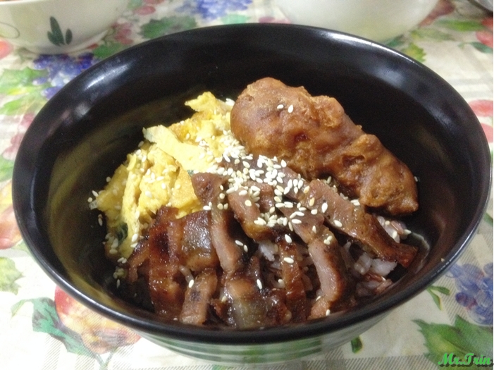 ข้าวสวยร้อนๆ 2 ทัพพี โปะด้วยไข่เจียวซอย สามชั้นย่างซอสหั่นชิ้นเล็กๆ ปีกบนไก่ทอดกรอบๆ 1 ชิ้น โรยด้วยงาขาวคั่ว