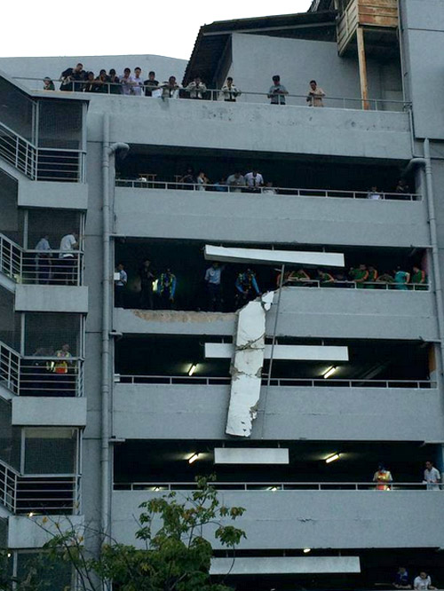 พอดีเห็นรูปลานจอดรถที่พังแล้วแอบหวังว่าข้างในปูนจะมีอะไรมากกว่านี้ เช่นโครงเหล็ก , เสาเหล็ก แต่ที่เห็นนั้นมัน แผ่นปูนเพียวๆเบรย T-T