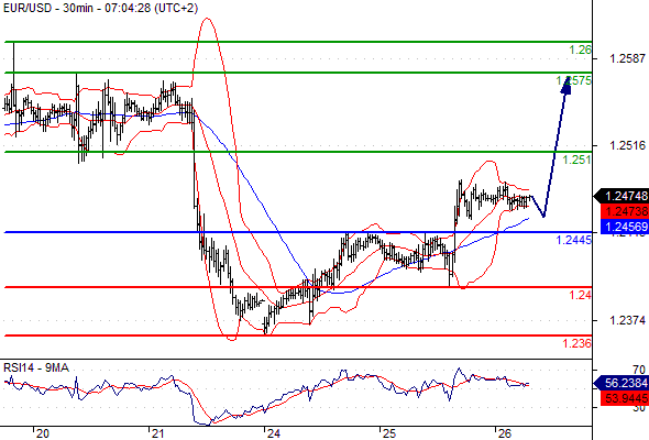 Our preference: Long positions above 1.2445 with targets @ 1.251 & 1.2575 in extension.